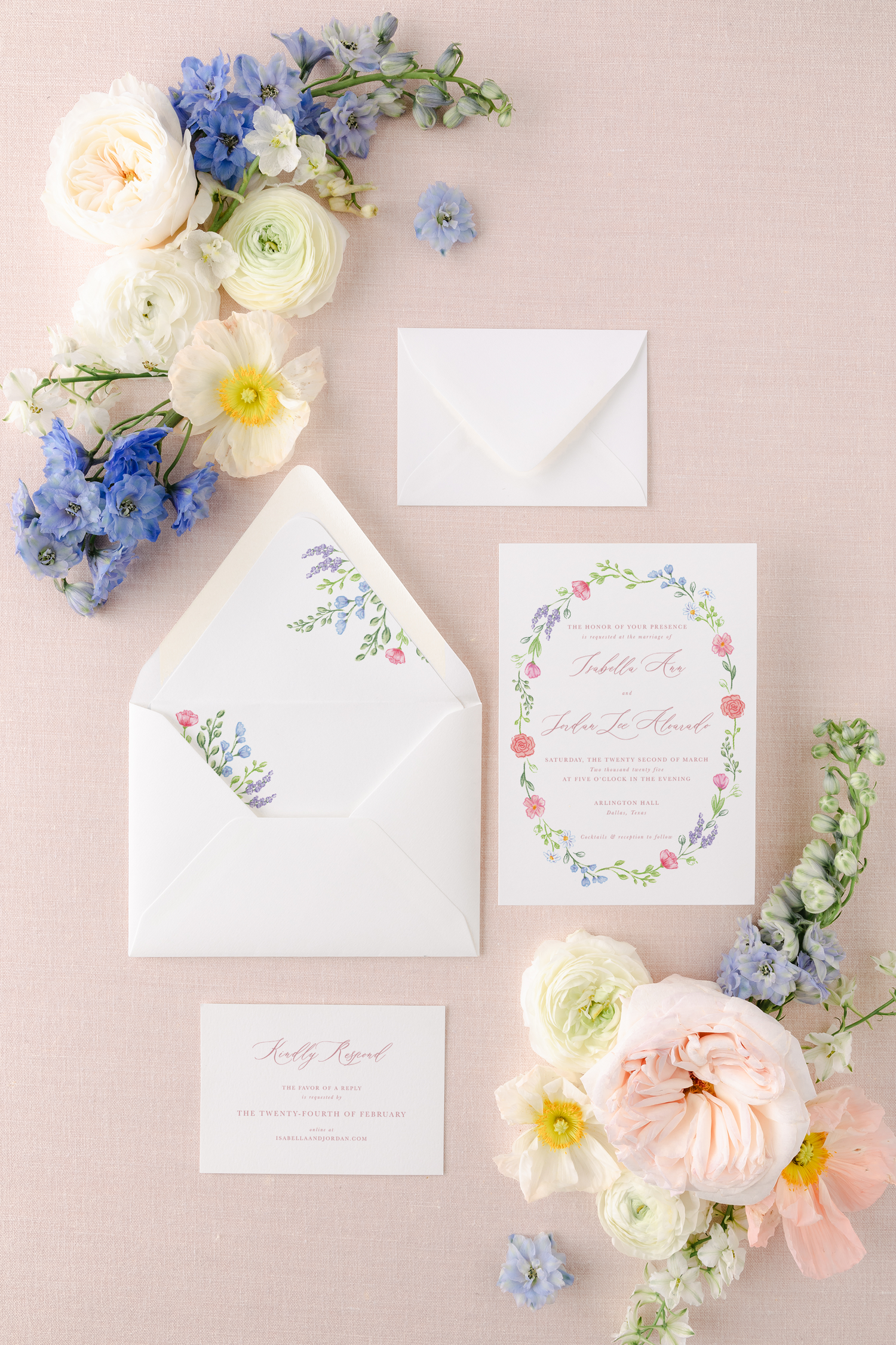 The elegant typography on this suite adds a delightful dash of whimsy to a full floral wreath, without sacrificing simplicity. Click on the product images below to view additional details, pricing, and book your suite.