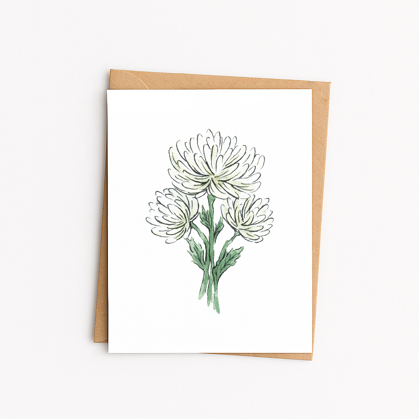 This card features three white chrysanthemum flowers in a bouquet with dark green stems on a white background. Perfect for any and every occasion, this card is extremely versatile. Each card comes packaged in a clear plastic sleeve.