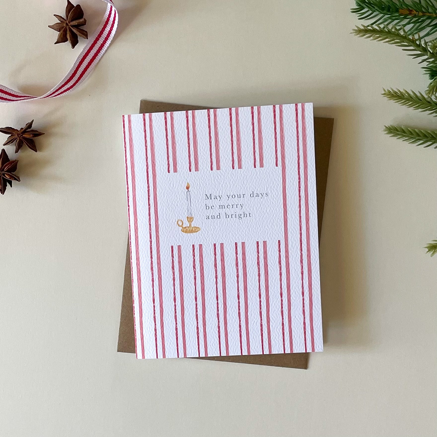 Send happy holiday wishes with this beautiful Christmas greeting card featuring a hand-painted candle on cheerful red candy stripes, finished with the heartfelt message “May Your Days Be Merry and Bright.”