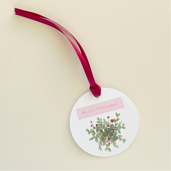 Complete your holiday gift wrapping with the cutest gift tags! Perfect for decorating this year's Christmas gifts in a sweet and whimsical way! These gift tags feature an illustration of a classic mistletoe and holly bouquet.